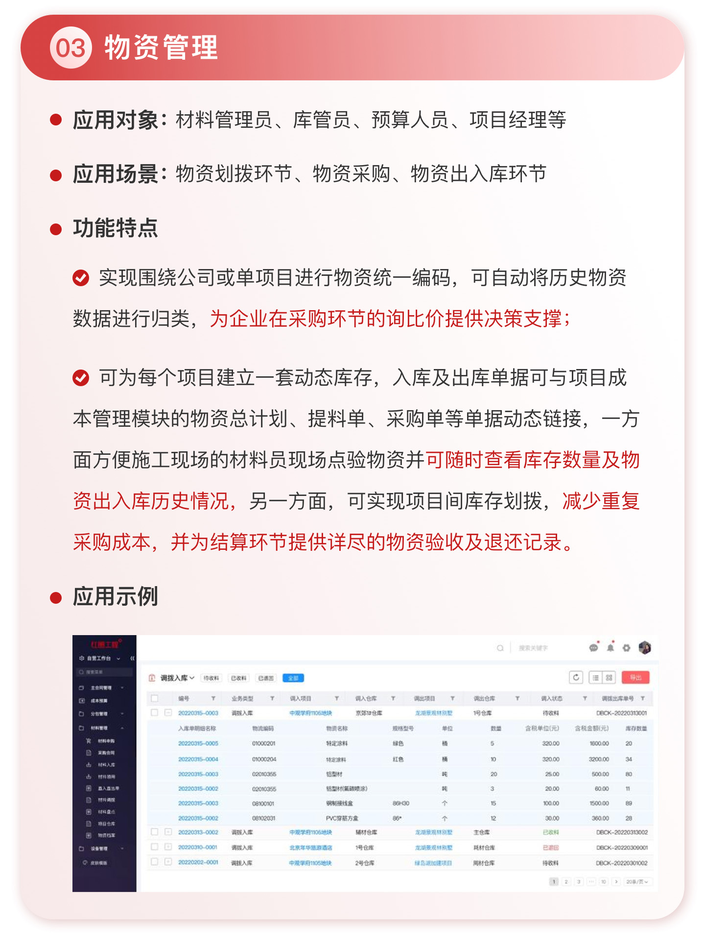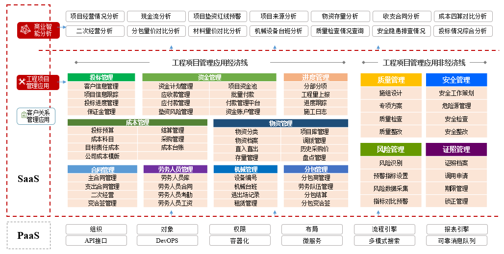 在工程項(xiàng)目管理領(lǐng)域,紅圈在 PaaS 平臺(tái)基礎(chǔ)上深入結(jié)合建筑工程企業(yè)的業(yè)務(wù)場景,針對(duì)其現(xiàn)金流管理薄弱、成本不可控、項(xiàng)目進(jìn)度滯后、質(zhì)量問題頻發(fā)和安全風(fēng)險(xiǎn)較多等痛點(diǎn),通過資金管理、成本管理、物資管理、安全質(zhì)量管理、投標(biāo)管理、勞務(wù)管理、證照管理等功能模塊,使執(zhí)行人員業(yè)務(wù)流程標(biāo)準(zhǔn)化、透明化。