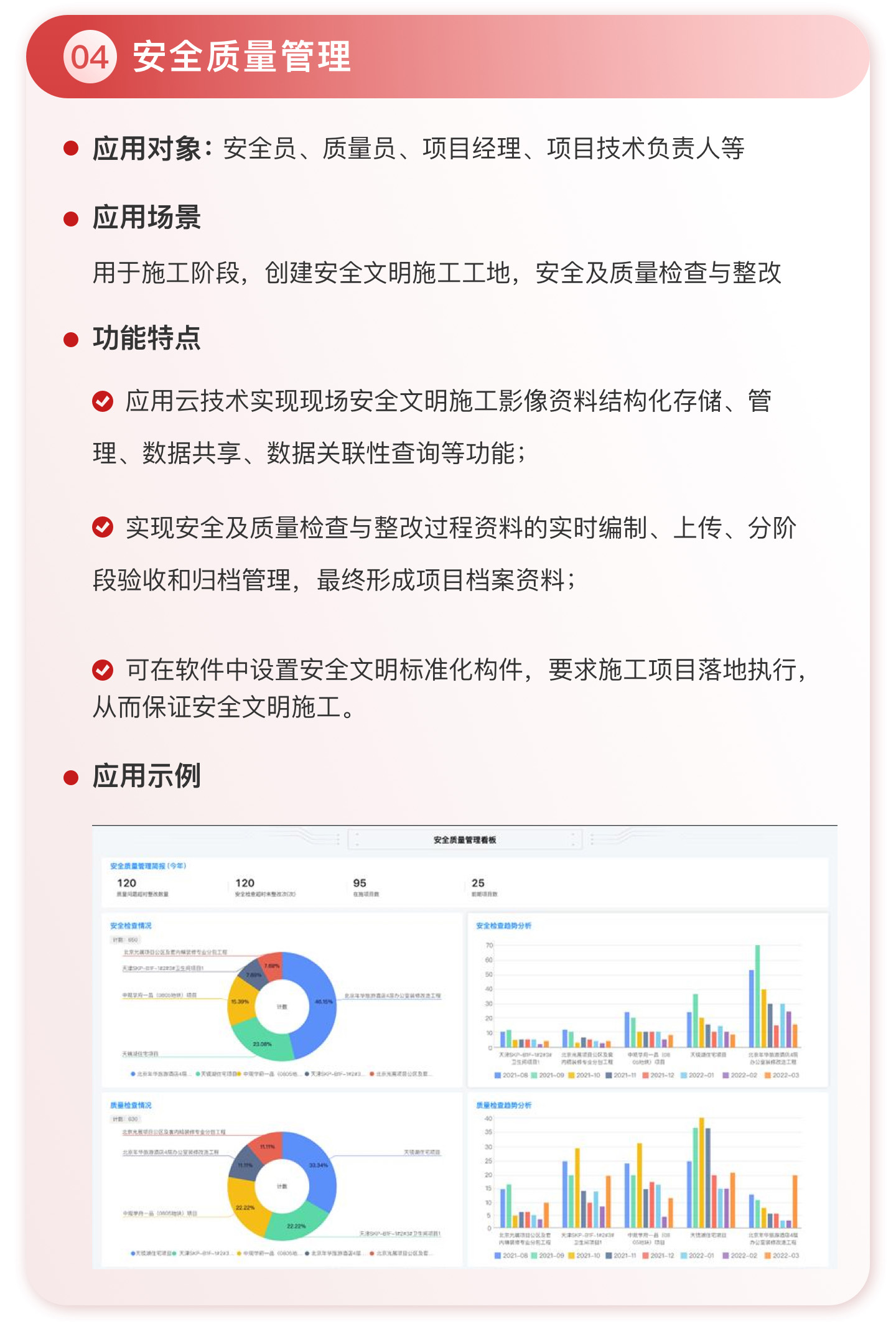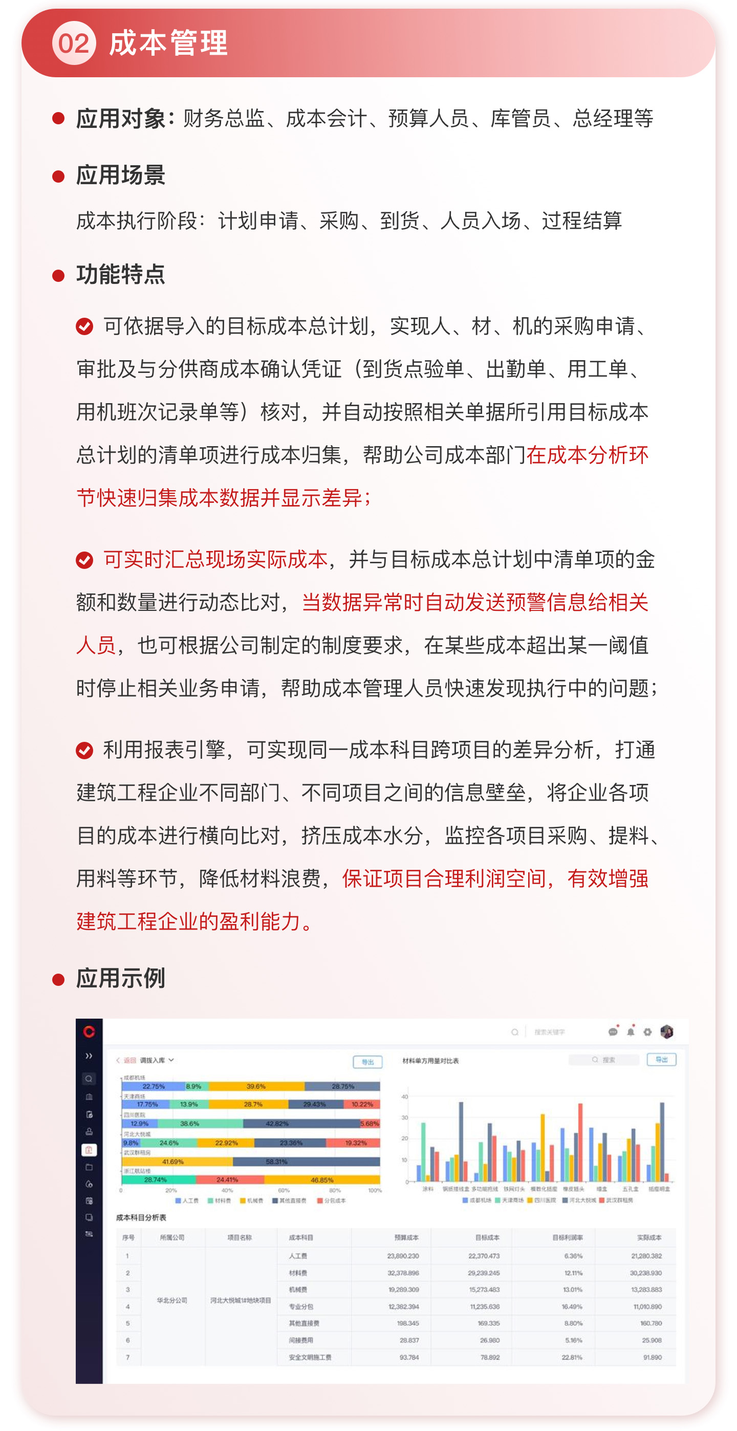 此外,紅圈系統(tǒng)能夠?yàn)榻ㄖこ唐髽I(yè)決策者實(shí)時(shí)呈現(xiàn)動(dòng)態(tài)數(shù)據(jù)、提供智能數(shù)據(jù)分析,讓管理者實(shí)時(shí)了解項(xiàng)目的整體運(yùn)營效率及效益是否達(dá)標(biāo)、經(jīng)營風(fēng)險(xiǎn)是否可控,滿足建筑工程企業(yè)數(shù)字化管理升級(jí)的需求,提升企業(yè)經(jīng)營管理能力,實(shí)現(xiàn)工程項(xiàng)目施工全生命周期的降本增效。該產(chǎn)品主要應(yīng)用于產(chǎn)值為 5,000 萬-20 億的建筑工程行業(yè)企業(yè)。