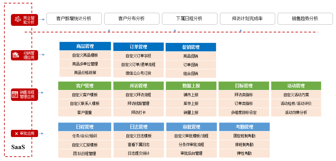 紅圈營銷+是一款兼顧通用協(xié)同辦公應(yīng)用基礎(chǔ)上,主要為泛快消行業(yè)客戶提供客戶管理與銷售協(xié)同管理的客戶關(guān)系管理 SaaS 產(chǎn)品。產(chǎn)品具有進(jìn)銷存管理、車銷管理、數(shù)據(jù)上報(bào)、營銷活動(dòng)管理、目標(biāo)管理等功能,幫助企業(yè)有效控制營銷費(fèi)用和通路管理,提高銷售管理效率,為企業(yè)提供數(shù)據(jù)賦能,助力模式轉(zhuǎn)型。