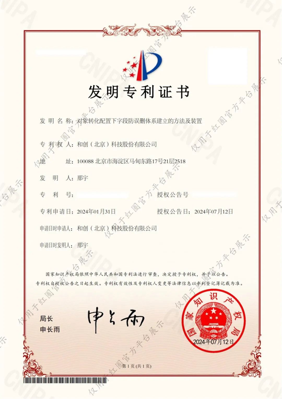 在科技發(fā)展日新月異的今天,每一項(xiàng)新的專利都代表著一次技術(shù)的革新與突破。近日,和創(chuàng)科技再迎一項(xiàng)技術(shù)創(chuàng)新,榮獲最新專利——“對象轉(zhuǎn)化配置下字段防誤刪體系建立的方法及裝置”。