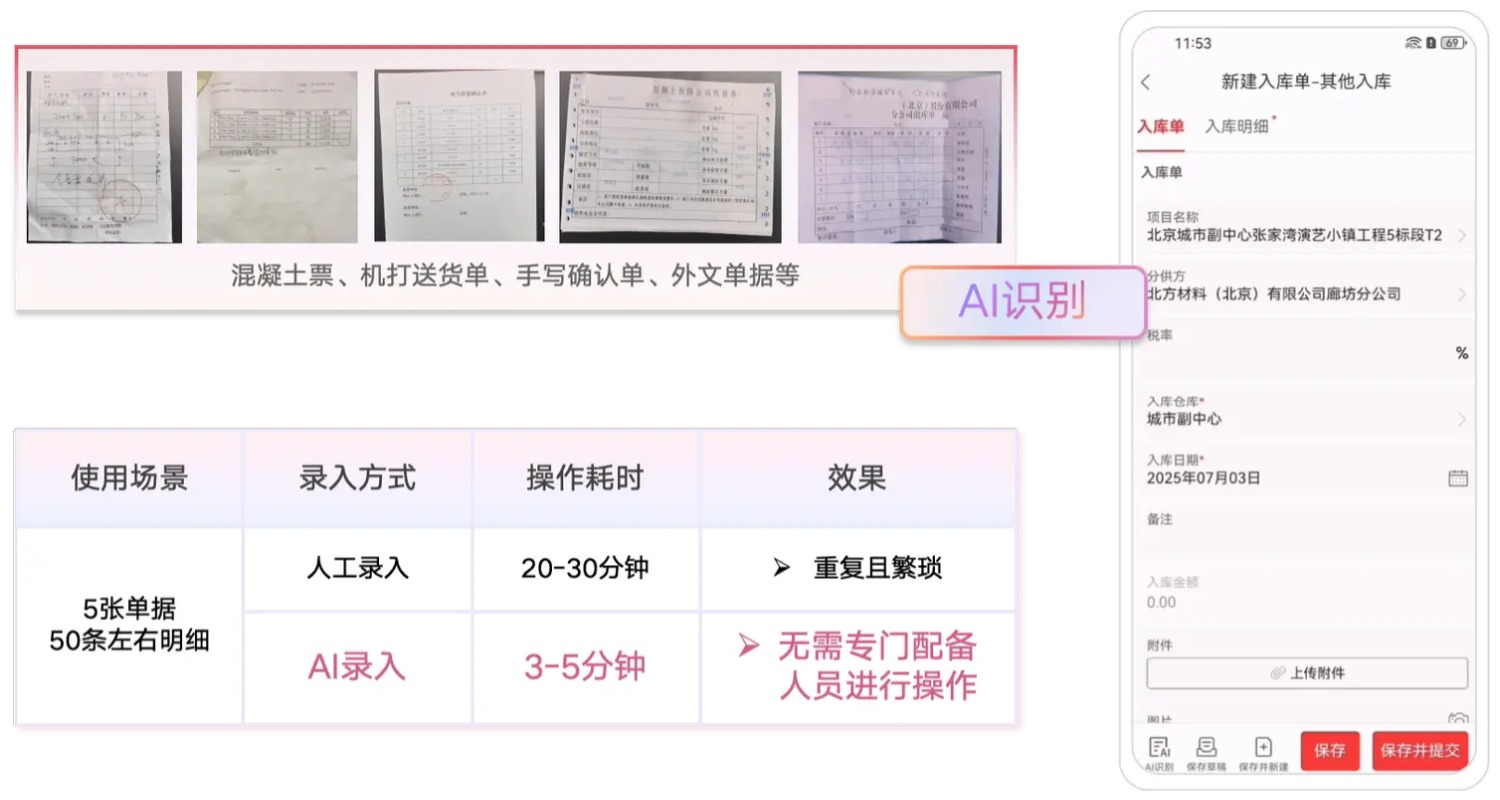 AI錄單助手能夠自動(dòng)從入庫(kù)單中識(shí)別出材料的名稱、規(guī)格、數(shù)量等信息,并進(jìn)行數(shù)據(jù)回填。系統(tǒng)還會(huì)在數(shù)據(jù)錄入時(shí)進(jìn)行實(shí)時(shí)成本預(yù)警,確保企業(yè)在采購(gòu)環(huán)節(jié)能夠精確把控成本。通過AI的輔助,入庫(kù)單的錄入時(shí)長(zhǎng)縮短了80%,而成本控制的準(zhǔn)確性提高了20%,極大提高了企業(yè)的資金使用效率。