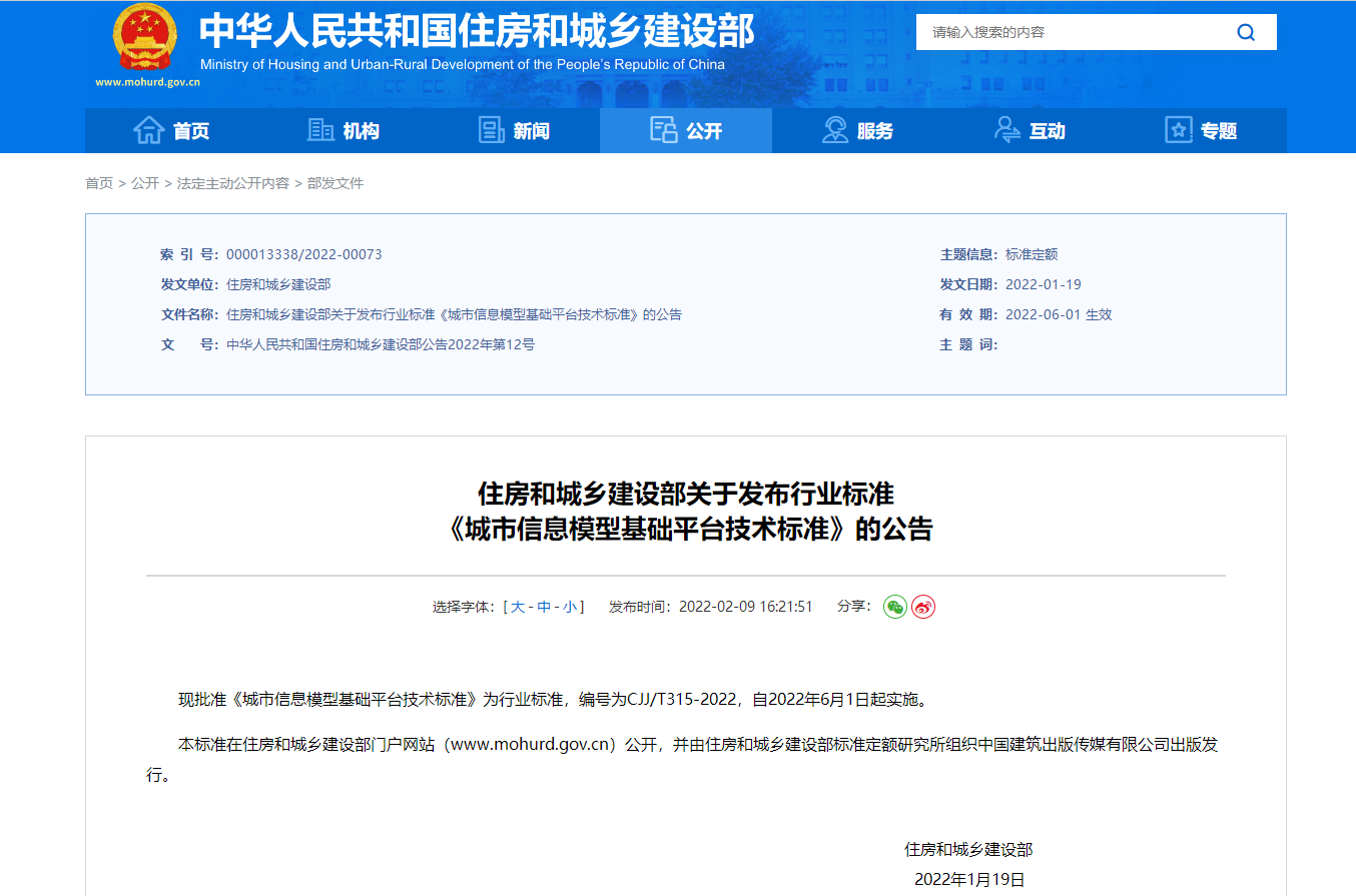 現(xiàn)批準(zhǔn)《城市信息模型基礎(chǔ)平臺(tái)技術(shù)標(biāo)準(zhǔn)》為行業(yè)標(biāo)準(zhǔn),編號(hào)為CJJ/T315-2022,自2022年6月1日起實(shí)施。