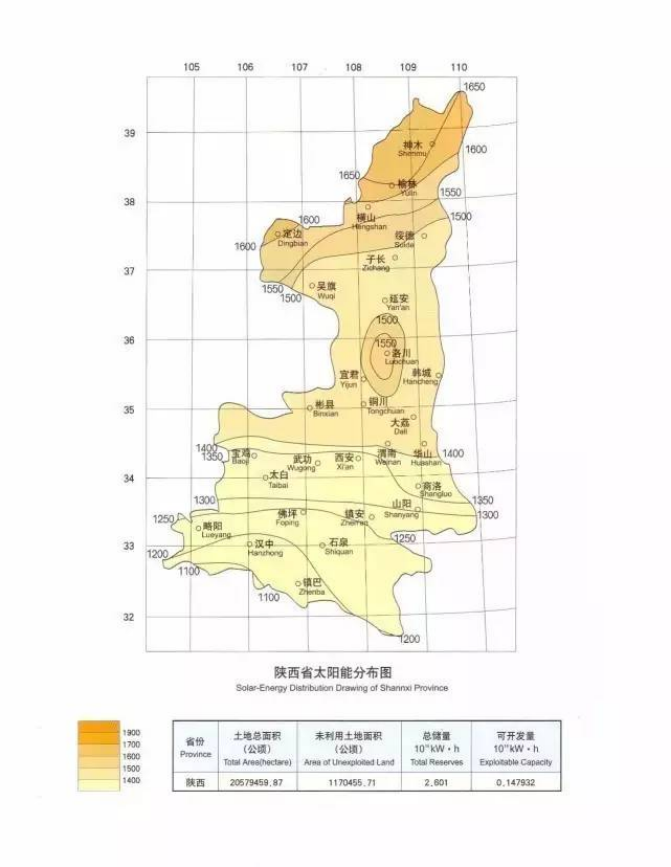 陜西省具有豐富的太陽(yáng)能資源,太陽(yáng)能資源空間分布特征是北部多于南部,全省太陽(yáng)能年總輻射量在4410~5400MJ/m2之間。初步推算,陜西的太陽(yáng)能資源經(jīng)濟(jì)技術(shù)可開發(fā)量大約1.1億千瓦。