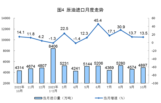原油生產增速略有加快,進口保持較快增長。10月份,生產原油1733萬噸,同比增長0.5%,增速比9月份加快0.2個百分點,日均產量55.9萬噸。進口原油4897萬噸,同比增長13.5%,增速比9月份放緩0.2個百分點。