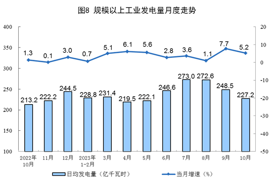 分品種看,10月份,火電、太陽能發電增速加快,水電增速回落,核電由增轉降,風電降幅擴大。其中,火電增長4.0%,增速比9月份加快1.7個百分點;水電增長21.8%,增速比9月份回落17.4個百分點;核電下降0.2%,9月份增速為6.7%;風電下降13.1%,降幅比9月份擴大11.5個百分點;太陽能發電增長15.3%,增速比9月份加快8.5個百分點。