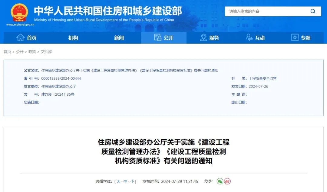 7月29日,住房城鄉(xiāng)建設部辦公廳發(fā)布關(guān)于實施《建設工程質(zhì)量檢測管理辦法》《建設工程質(zhì)量檢測機構(gòu)資質(zhì)標準》有關(guān)問題的通知。通知提出:為保障建設工程質(zhì)量檢測新舊資質(zhì)平穩(wěn)過渡,新舊資質(zhì)過渡期延長至2024年10月31日。