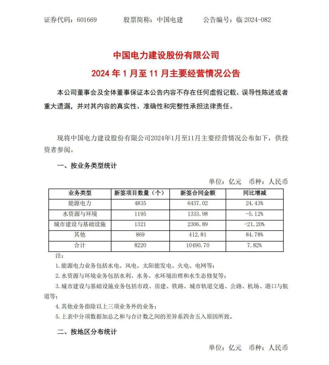 12月20日,中國電建發(fā)布《 中國電力建設(shè)股份有限公司2024年1月至11月主要經(jīng)營情況公告》,披露了2024年1-11月,2024年11月,公司新簽合同金額在人民幣5億元以上的單體項(xiàng)目共有40個(gè)。