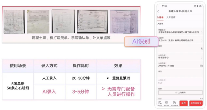 數(shù)據(jù)的源頭是業(yè)務單據(jù),錄入的繁瑣與錯誤是成本失控的隱患之一。紅圈AI系列智能產(chǎn)品中的AI錄單助手作為企業(yè)的“智能掃描儀”,能通過大模型自動識別混凝土票、送貨單、手寫確認單乃至合同等各類單據(jù),實現(xiàn)從圖像識別到高質(zhì)量系統(tǒng)錄入的秒級閉環(huán),可減少90%人工操作。它不僅能提取關鍵字段,更能智能匹配合同明細、關聯(lián)歷史數(shù)據(jù),讓成本歸集更智能、溯源更方便,從而迭代了整個成本管控流程。