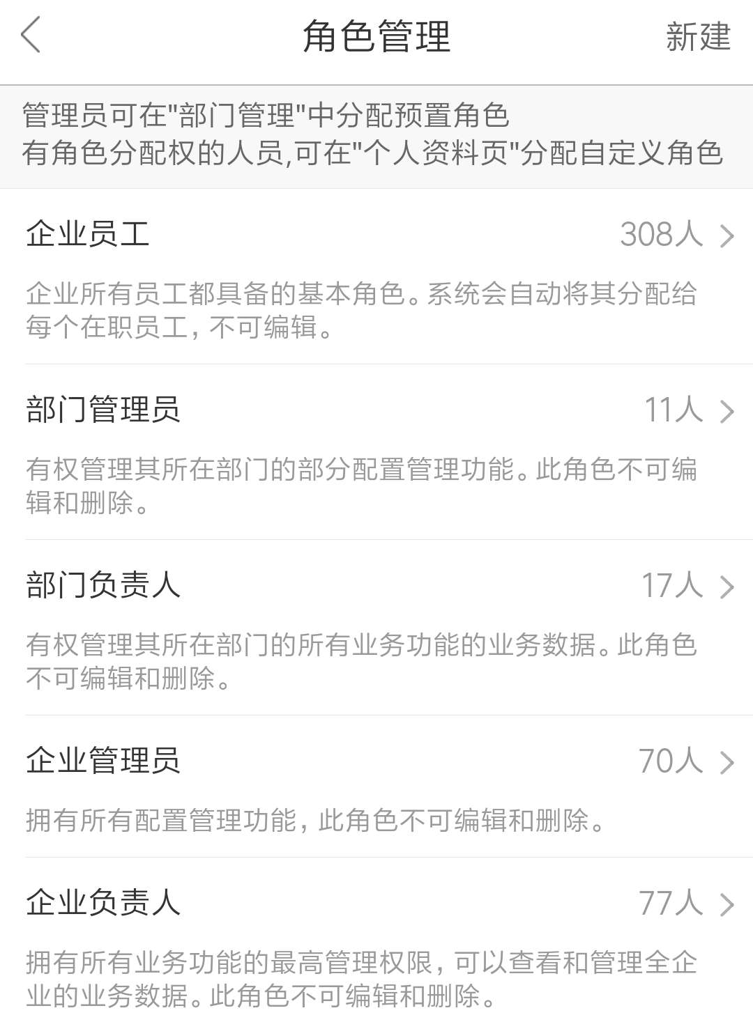 在角色管理中,會(huì)默認(rèn)有五種角色:企業(yè)負(fù)責(zé)人、企業(yè)管理員、部門(mén)負(fù)責(zé)人、部門(mén)管理員、企業(yè)員工。